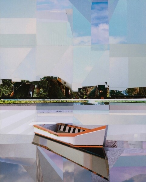 Berrett begins her new compositions with hundreds of cut paper pieces from reclaimed magazines. As with her oil paintings, she works from dark to light and from big shapes to small. Combining “already made” textures and colors, she represents the familiar in unexpected ways, embracing just enough dissonance so that it becomes new again.